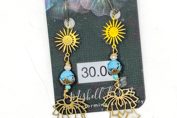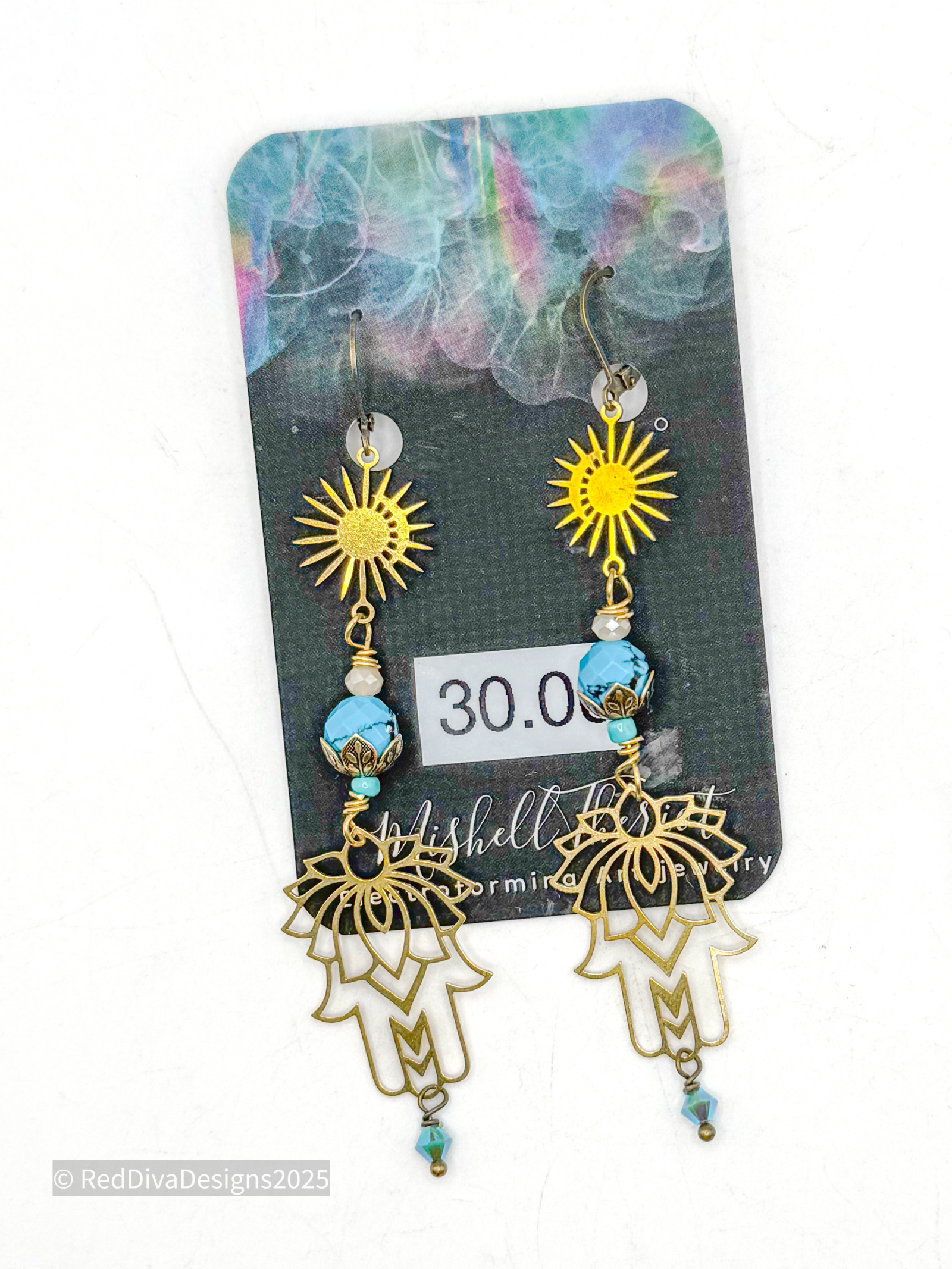 Brass hamsa hand with lotus and turqouise finished on lead and nickle free leverbacks 3" long. Very lightweight.