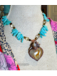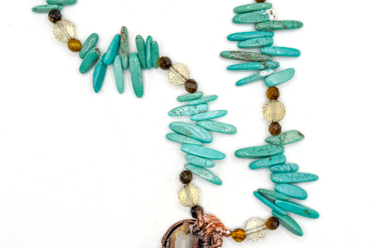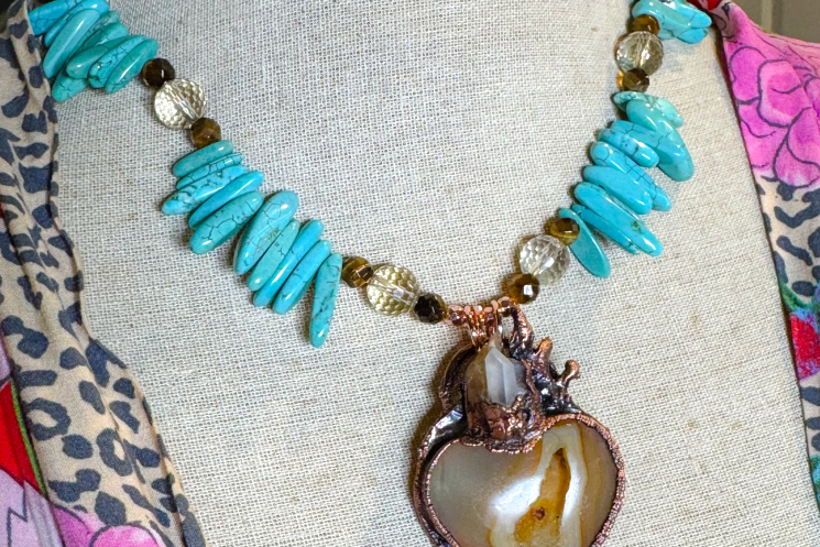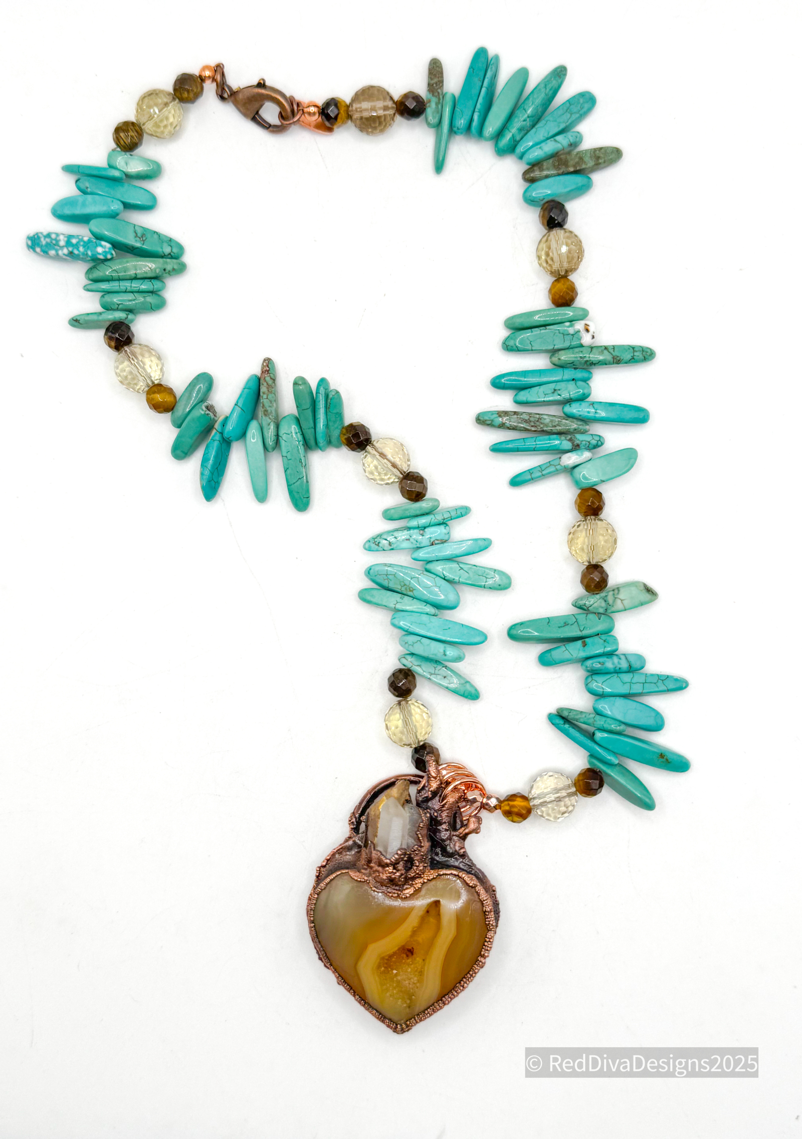 Agate Druzy Heart copper electroformed in Sacred Heart fashion that I hand draw and cut to each individual stone. Finished on a mixture of Lemon Quartz, turqouise and tiger eye 19" long.